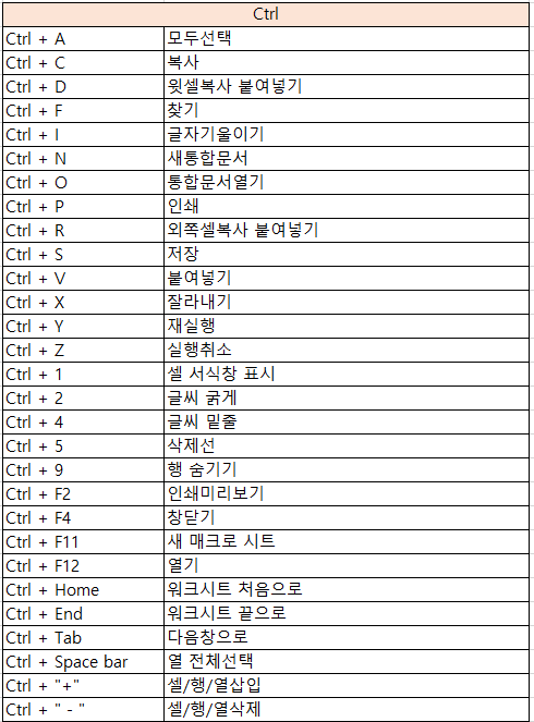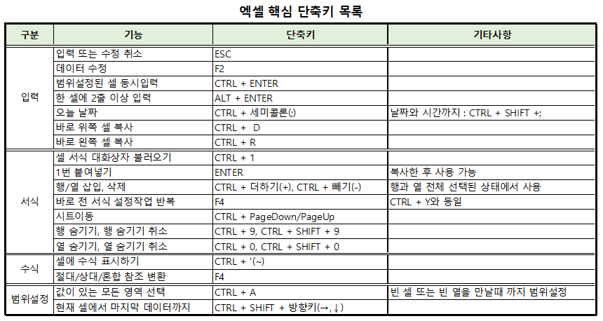 ▶ 엑셀 핵심 단축키 목록