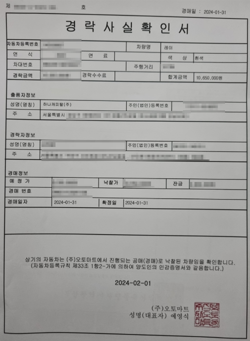 이럴경우 오토마트 담당 직원에게 문의를 해보자. 보통 오토마트에서 보내주는 서류가 경락사실 확인서 이다.