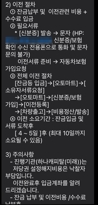 - 잔금 입금 → 오토마트에 서류(신분증, 보험가입) 송부 → 비용 정산 → 오토마트에서 이전등록 →